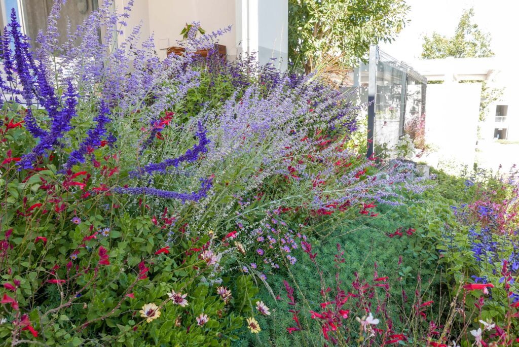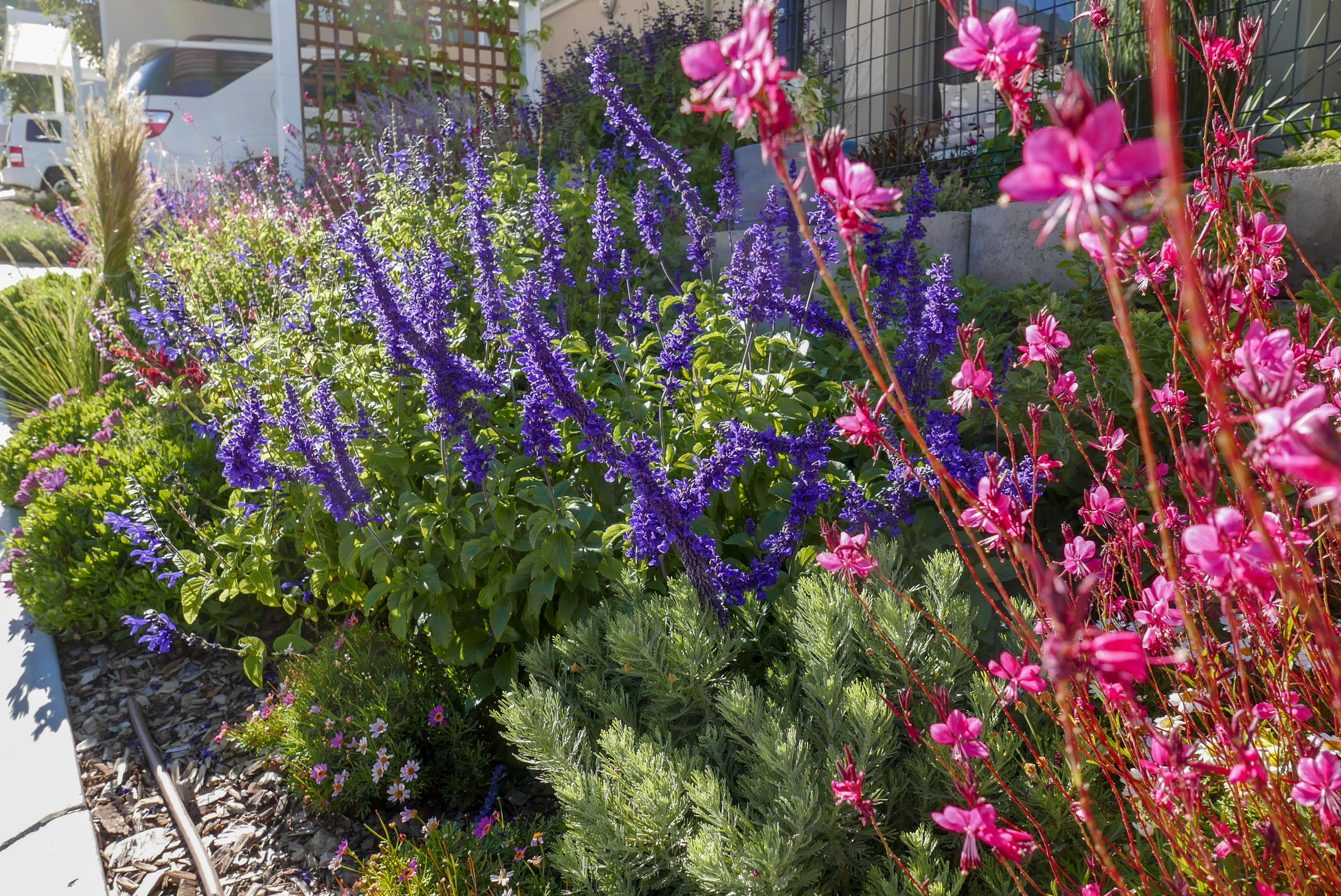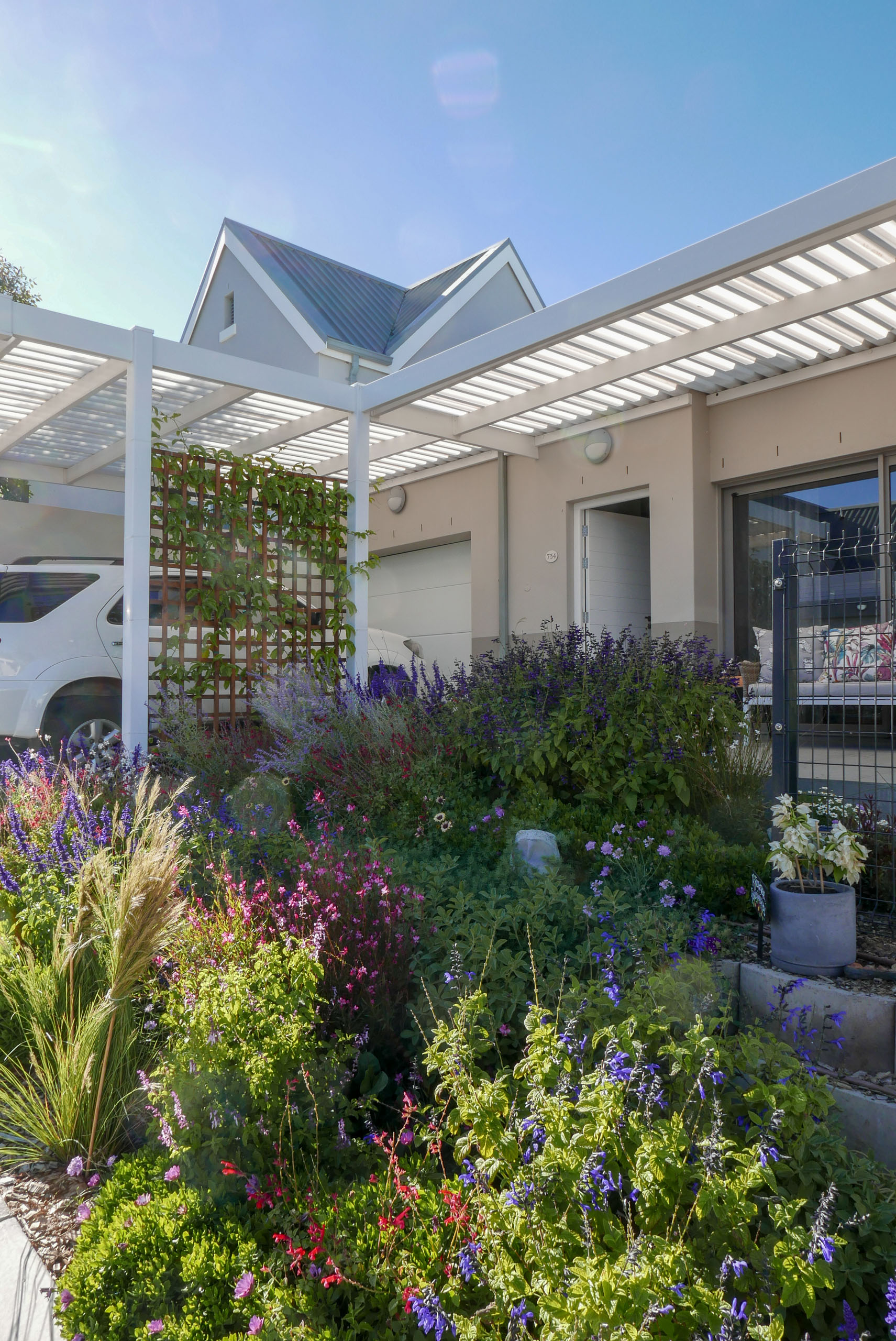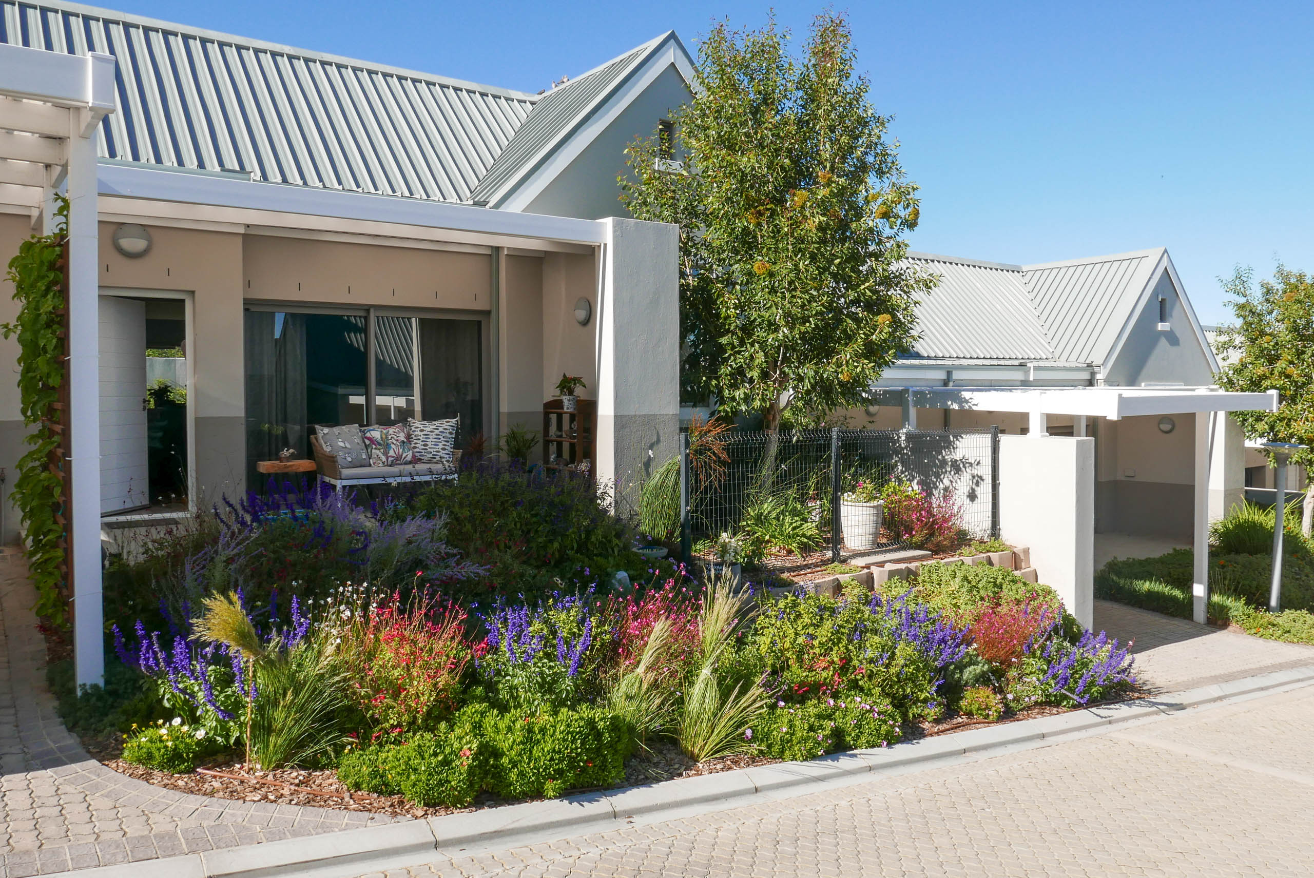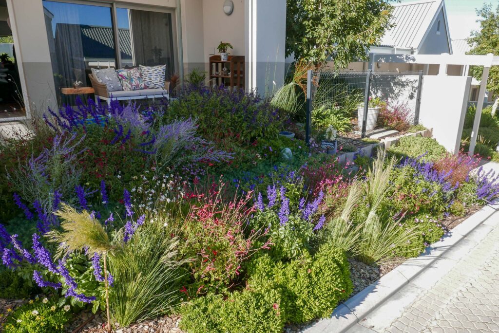 A lovely little garden for the most amazing clients of ours! In the front we planted a variety of salvias, perovskia, gaura and osteospermum for that cottage flowery kind of vibe. At the back there are more robust indigenous shrubs, a new lemon tree and two custom veggie planter boxes.