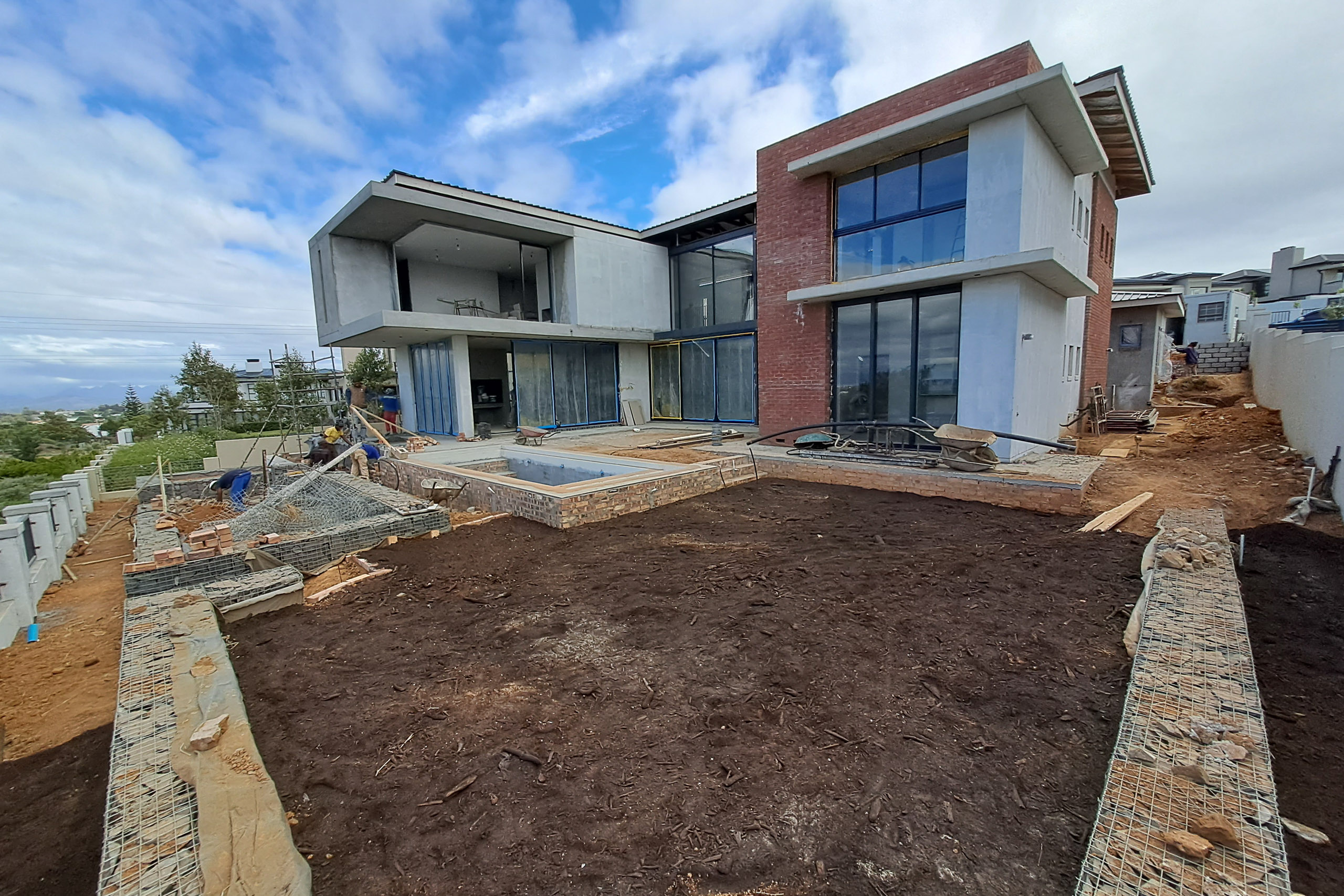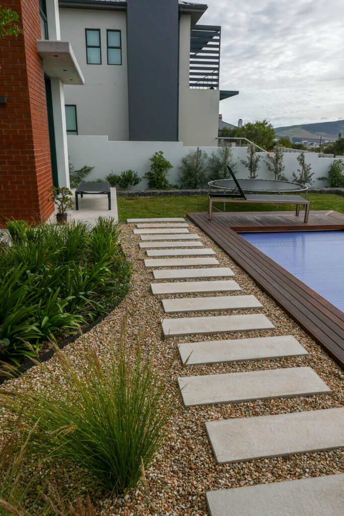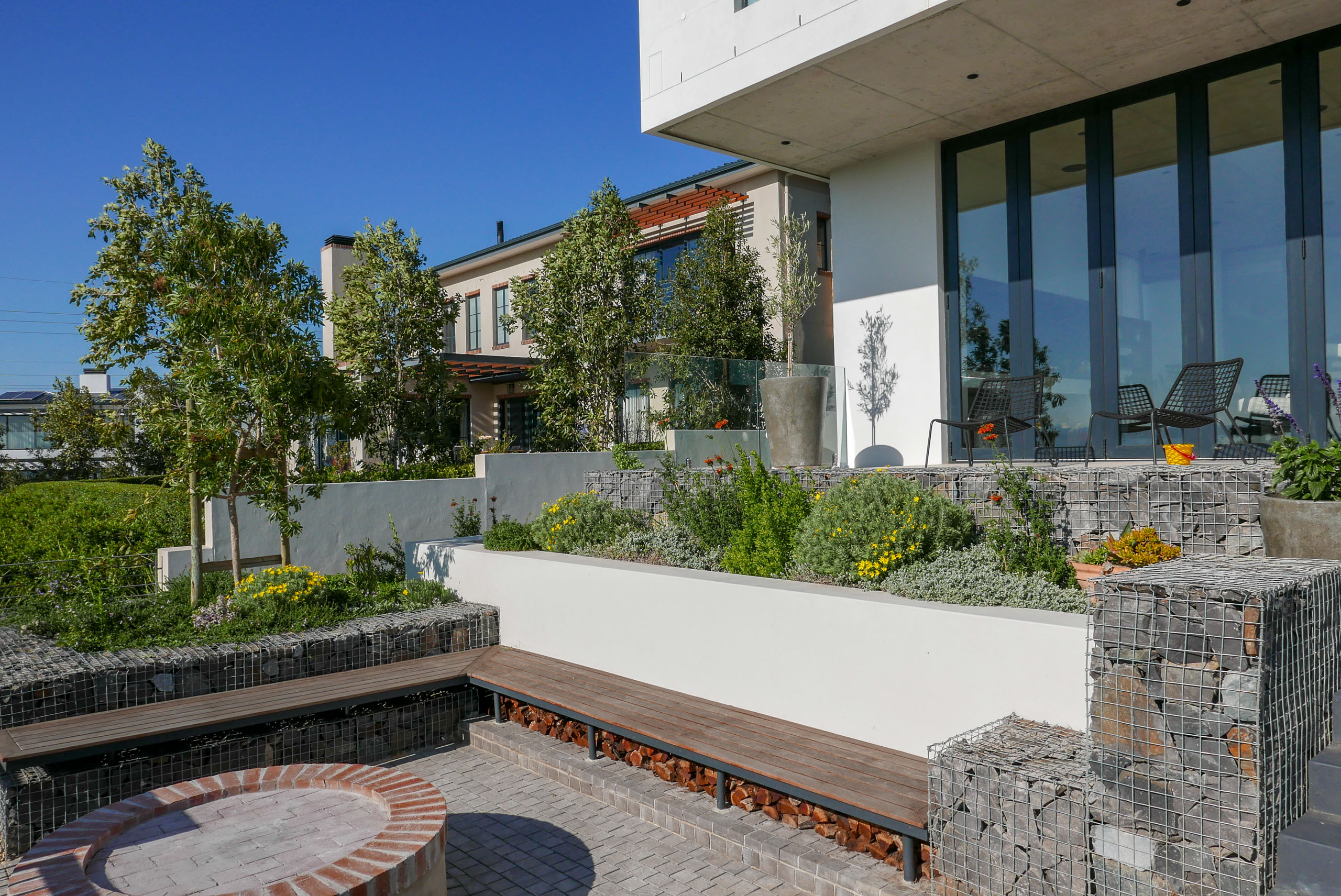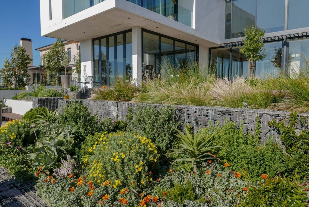 The first garden we designed and planted in Clara Anna Fontein. The layout of the garden was largely dictated by the footprint of the house and the different levels as it is such a sloping site. This was brilliantly dealt with by Roelof Rabe Argitekte who designed the home to have a strong connection with the external spaces by using a lot of glass and large staking doors.